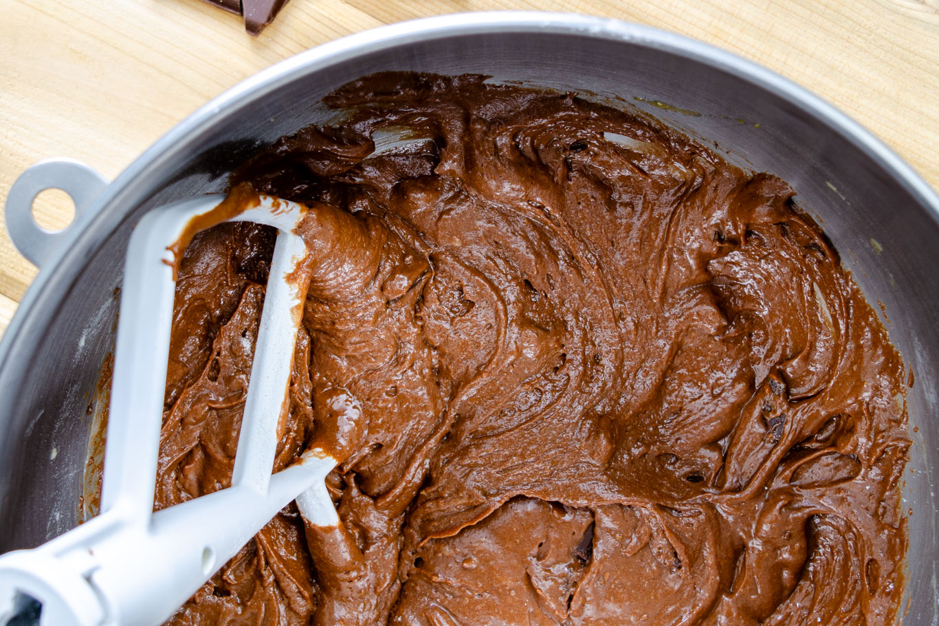 - Combine chocolate mixture with egg mixture then add dry ingredient mixture. Also, add additional chopped chocolate. Switch stand mixer to the paddle attachment. Add melted chocolate to egg mixture and mix to combine. Add dry ingredient mixture. Mix until it just starts to come together. Add chopped chocolate and mix in.