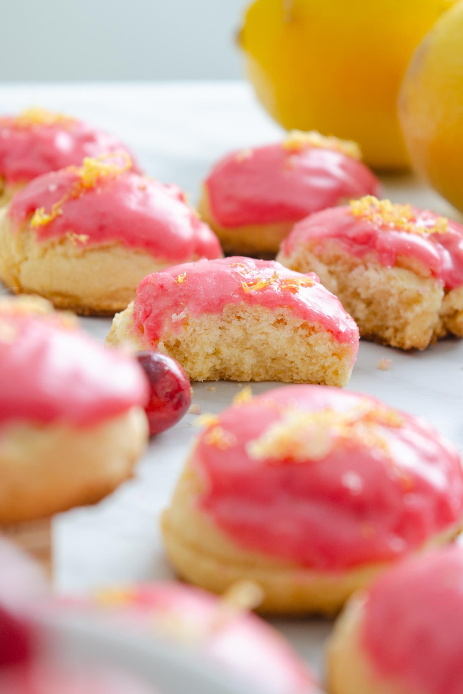These sugar cookies have a fresh lemon flavor mellowed by butter, dipped in a sweet and sour icing that pops with fresh lemon and cranberry. The no-chill lemon zested dough bakes up pillowy soft with a slight chew.