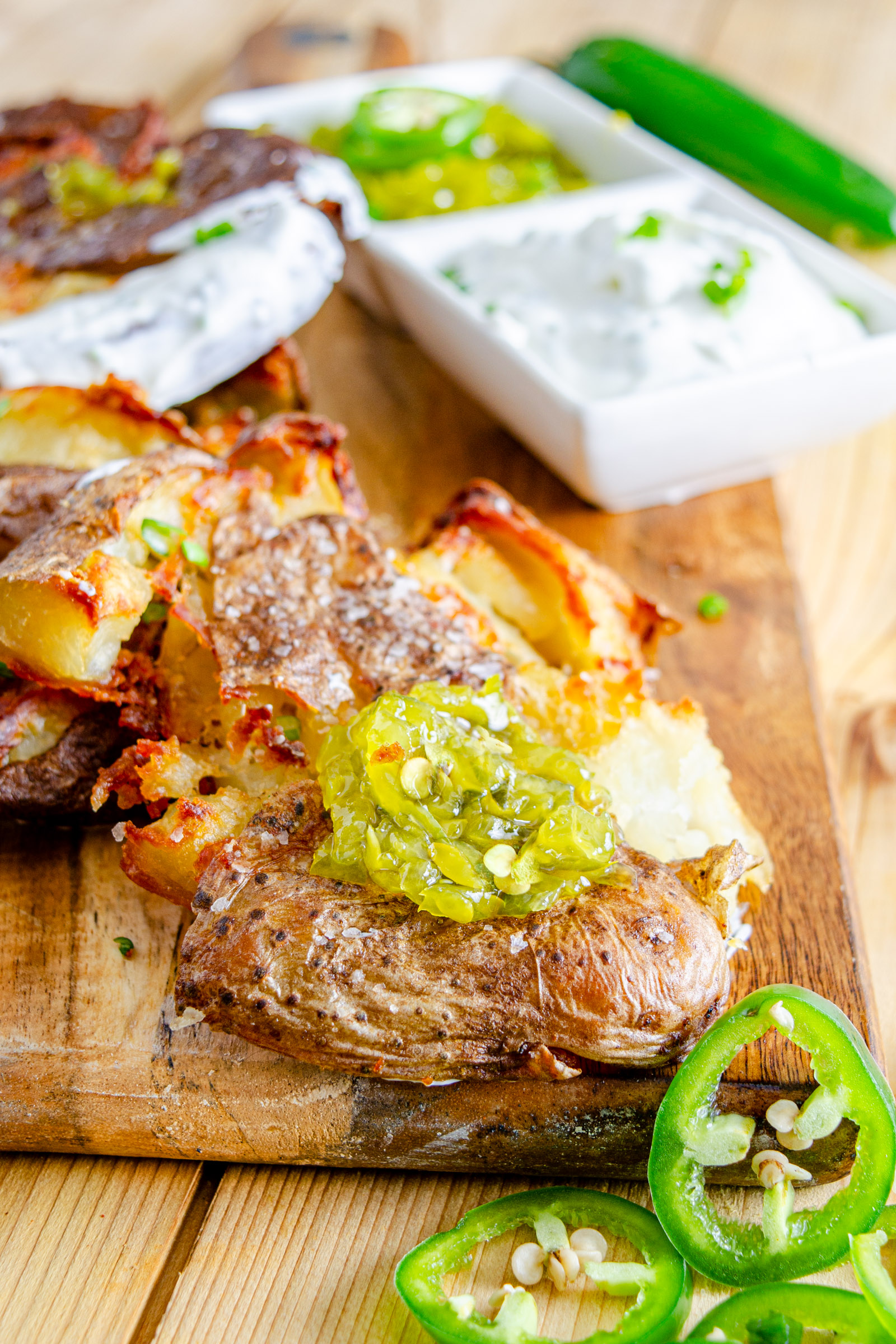 CRISPY POTATO SMASHERS RECIPE (PLUS JALAPENO HOT SAUCE AND YOGURT DIP)