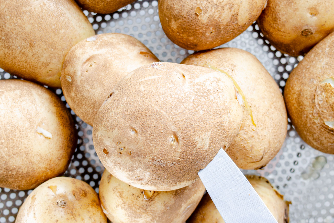 Smashing Tool: You will have an easier time smashing whole starchy potatoes (as opposed to waxy varieties). The best tool for the job is a potato smasher. If you don’t own one, you could try using a heavy cast iron pan (just be sure the bottom isn’t dirty).