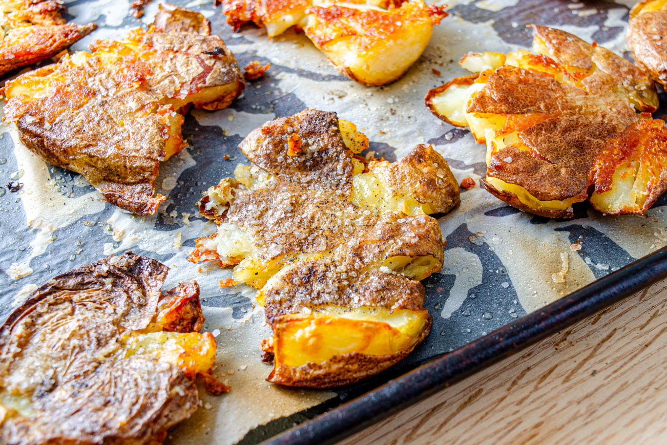 - Roast. Preheat the oven to 450°F. Strain the potatoes and allow to steam for a few minutes then transfer to a well-oiled baking tray. Use a potato masher or wooden spoon to press the potatoes gently until flattened (more contact with the tray + more surface area = more crispy potatoes). Allow to steam for a minute, then drizzle with the olive oil. Season with the salt and pepper. Roast for 30 to 40 minutes or until the potatoes appear golden brown and crisp.