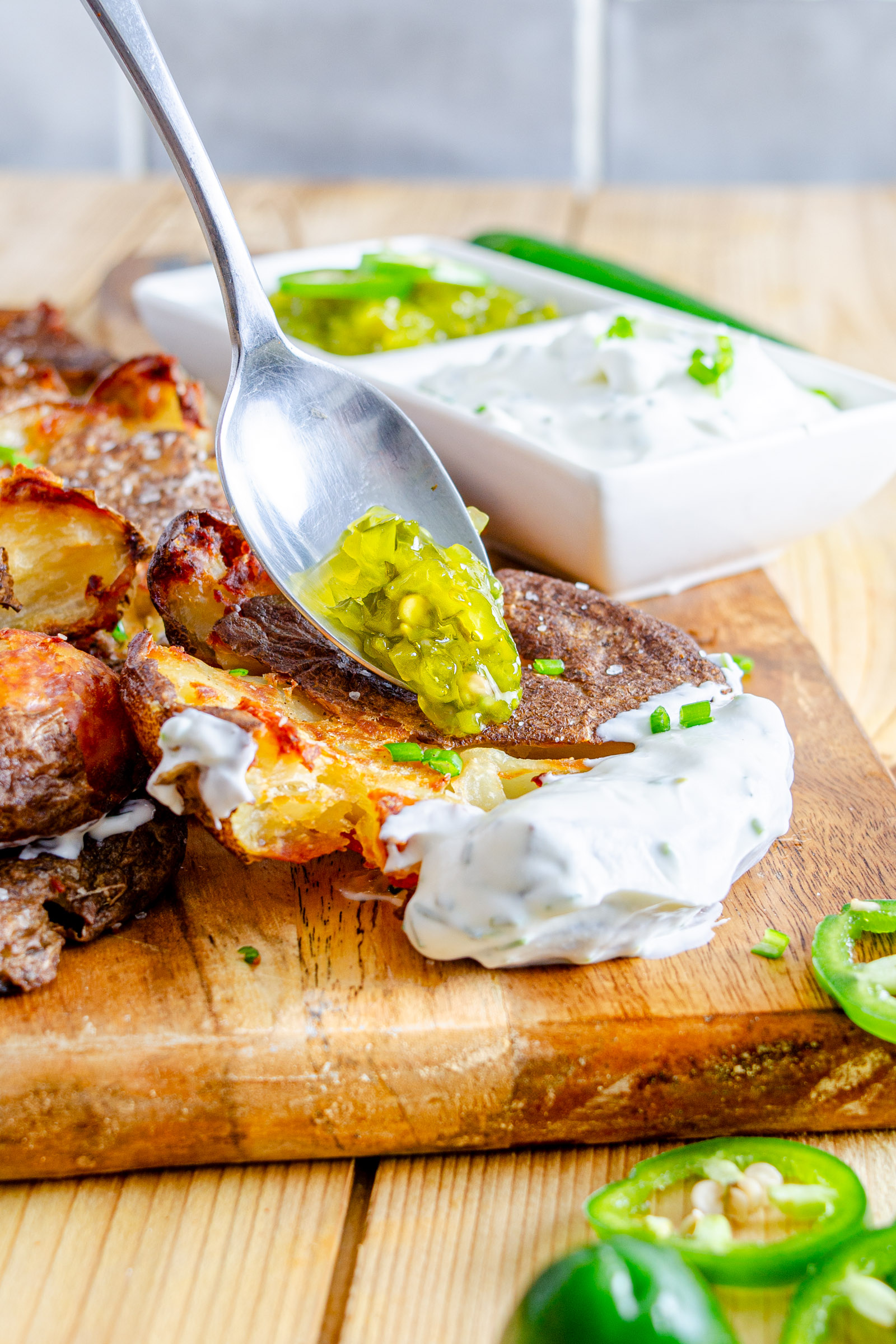 You need 4 ingredients to make potato smashers (potatoes, olive oil, salt, and pepper). The jalapenos, apple cider vinegar, Greek yogurt and chives are optional ingredients for making the condiments: